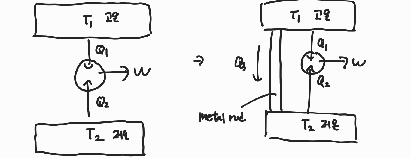 고온부와 저온부 사이에 금속막대를 두고, 금속 막대의 재질과 두께를 잘 조절하여 저온부에서 열기관으로 전해준 열량 \(Q_2\)과 고온부에서 저온부로 금속 막대를 통해 전도되는 열량 \(Q_3\)를 같게 만들 수 있을 것이다. 그러면 저온부는 알짜 열의 출입이 없으므로 온도가 유지되고, 열기관은 고온부에서만 열을 받아 일을 하게 된다. 그런데 1에서 열원을 한개만 사용하는 열기관은 존재할 수 없으므로 모순이 된다. 그러므로 고온부에서 열을 받아 저온부로 열을 전달해야 한다.(귀류법) 이는 바꾸어 말하면 열효율 100 %인 열기관은 못만든다는 이야기이다.