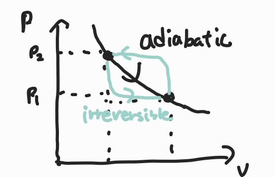 초기 압력과 부피를 \(P_1, V_1\), 나중 압력과 부피를 \(P_2, V_2 \)라 해보자. 만약 가역 기관이라면 팽창과 수축을 할때 한 일을 다음과 같다.